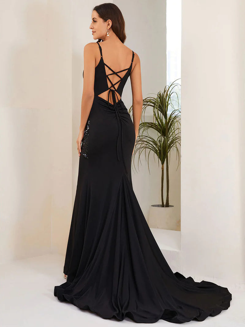 Monique is a stunning dress with sequins, a split, lace up back & a train! What more could you want.