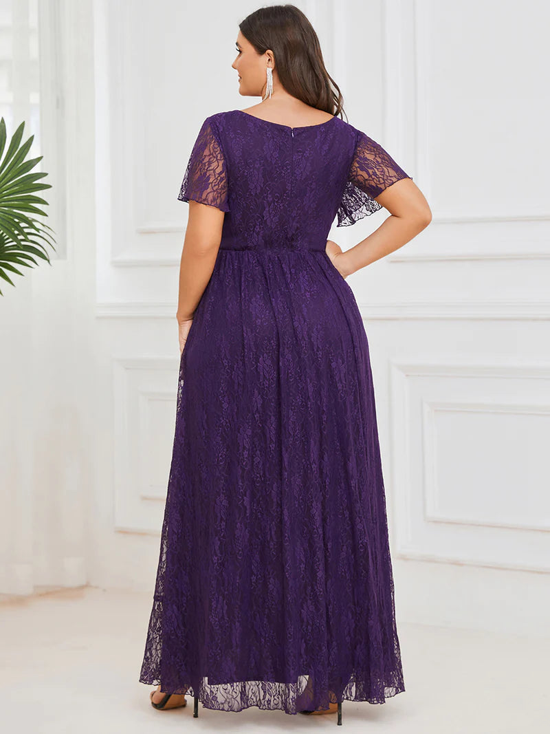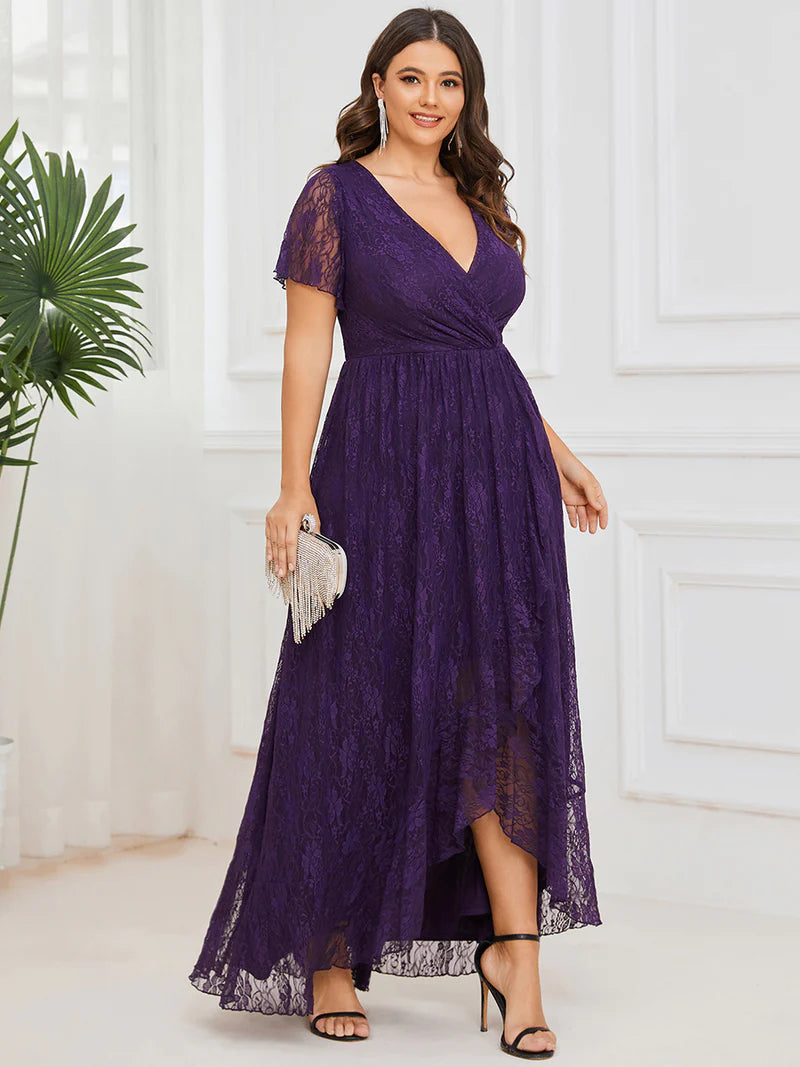Gianna is an elegant lace ankle length dress with split to tea length